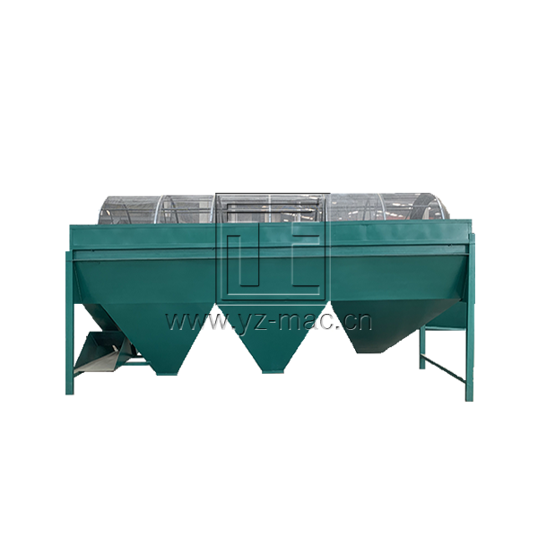 设备由圆柱形滚筒、机架、传动装置及进出料口组成。滚筒倾斜安装于机架上,电动机经过减速机带动滚筒绕其轴线旋转。当肥料物料进入旋转的滚筒后,受滚筒旋转产生的离心力与摩擦力作用,物料随筒壁上升到一定高度后,在重力作用下抛落。在不断的翻滚与下滑过程中,细小物料通过安装在筒体上的筛网排出,而粗大物料则顺着滚筒的倾斜角度向前端滑行,最终从后端的粗料口排出。