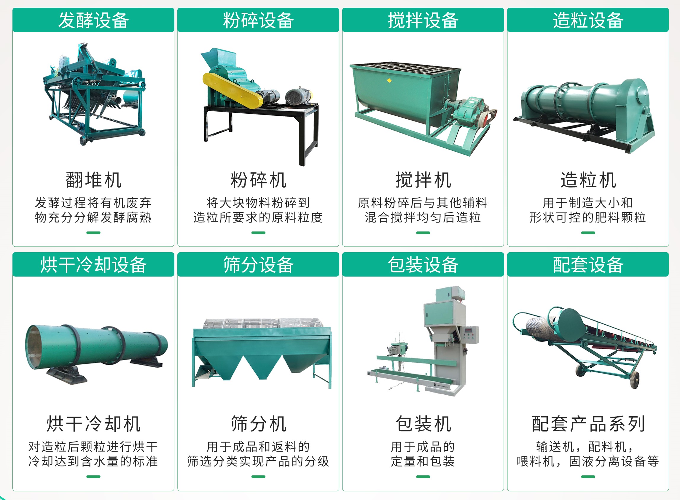有机肥加工设备包括了一系列用于有机肥料生产和加工的机械设备,例如粉碎机、混合机、造粒机、干燥机、筛分机等。这些设备通常被组合成有机肥料生产线,以完成从原材料到成品有机肥料的加工过程。具体的设备种类和配置会根据生产线的规模和要求而有所不同。